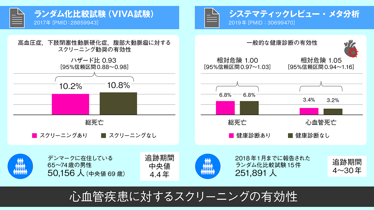 健常者を対象としたスクリーニングは,疾病の診断というよりは,疾病の早期発見を目的とした医学的介入の1つです。一般的に,疾病を早期に発見し早期に治療を受けることは,健康状態の維持や改善にとって重要だと考えられています。しかしながら,デンマークで実施されたDANCAVAS Ⅱ試験1)では,心血管疾患に対するスクリーニングを実施しても生命予後の改善に対する有効性は示されませんでした。